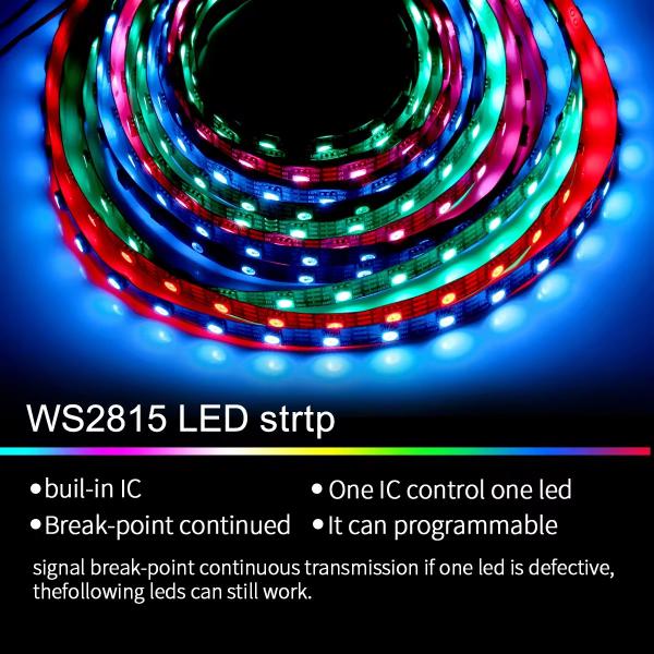 5.It is WS2815 led built-in IC ,one IC control one led and break-point continued , and it can be programmable .Signal break-point continuous transmission if one led is defective , the following leds can still work and are not affected.